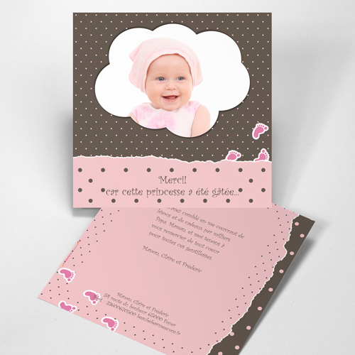 Très jolie carte aux couleurs douces pour remercier vos proches d'avoir été si attentionés avec votre petite puce. La photo de votre chérie sera placée dans un cadre en forme de nuage au recto, vous avez également la possibilité d'insérer un texte personnalisé au verso.